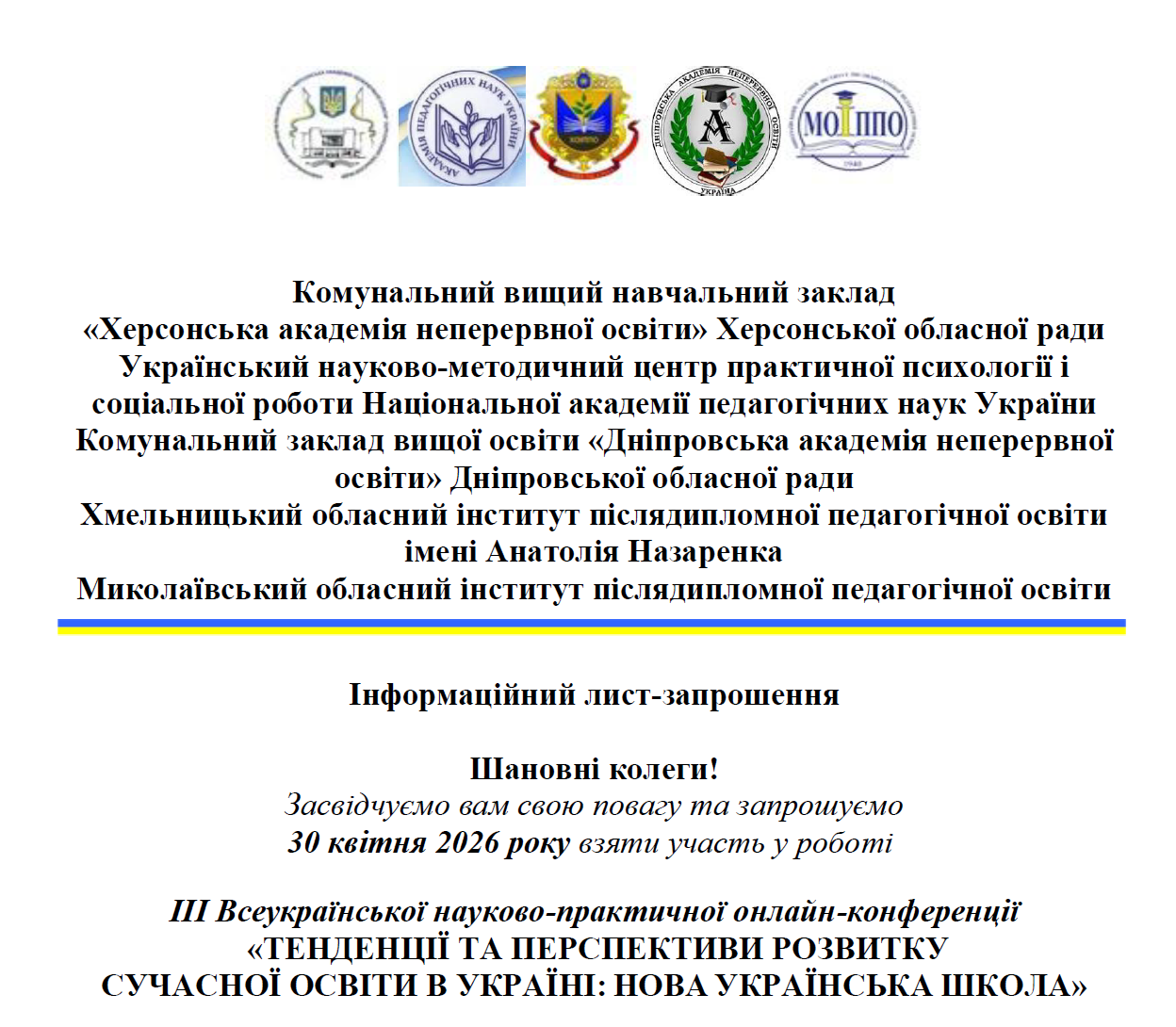 Запрошуємо взяти участь у роботі ІІІ Всеукраїнської науково-практичної онлайн-конференції «ТЕНДЕНЦІЇ ТА ПЕРСПЕКТИВИ РОЗВИТКУ СУЧАСНОЇ ОСВІТИ В УКРАЇНІ: НОВА УКРАЇНСЬКА ШКОЛА»