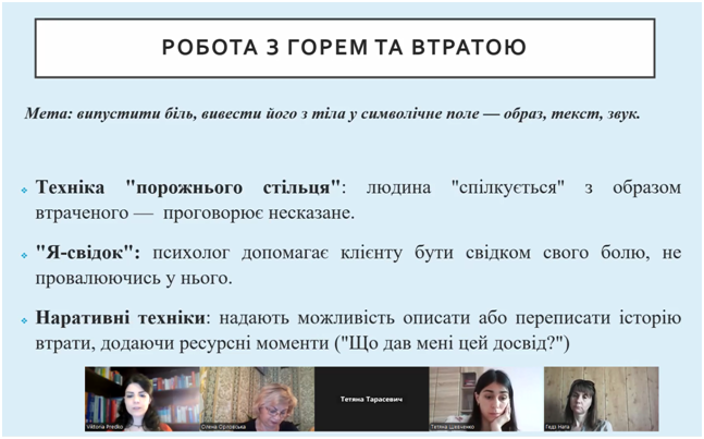 У процесі заняття були охарактеризовані основні емоційні й поведінкові реакції особистості на горе, зумовлені втратою. Визначені й класифіковані основні види горя — нормальне, ускладнене, заморожене, хронічне тощо. А також розкрито психологічний зміст основних стадій переживання горя (шок, заперечення, гнів, торг, депресія, прийняття).