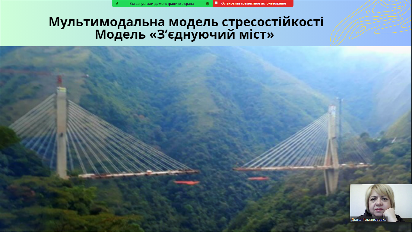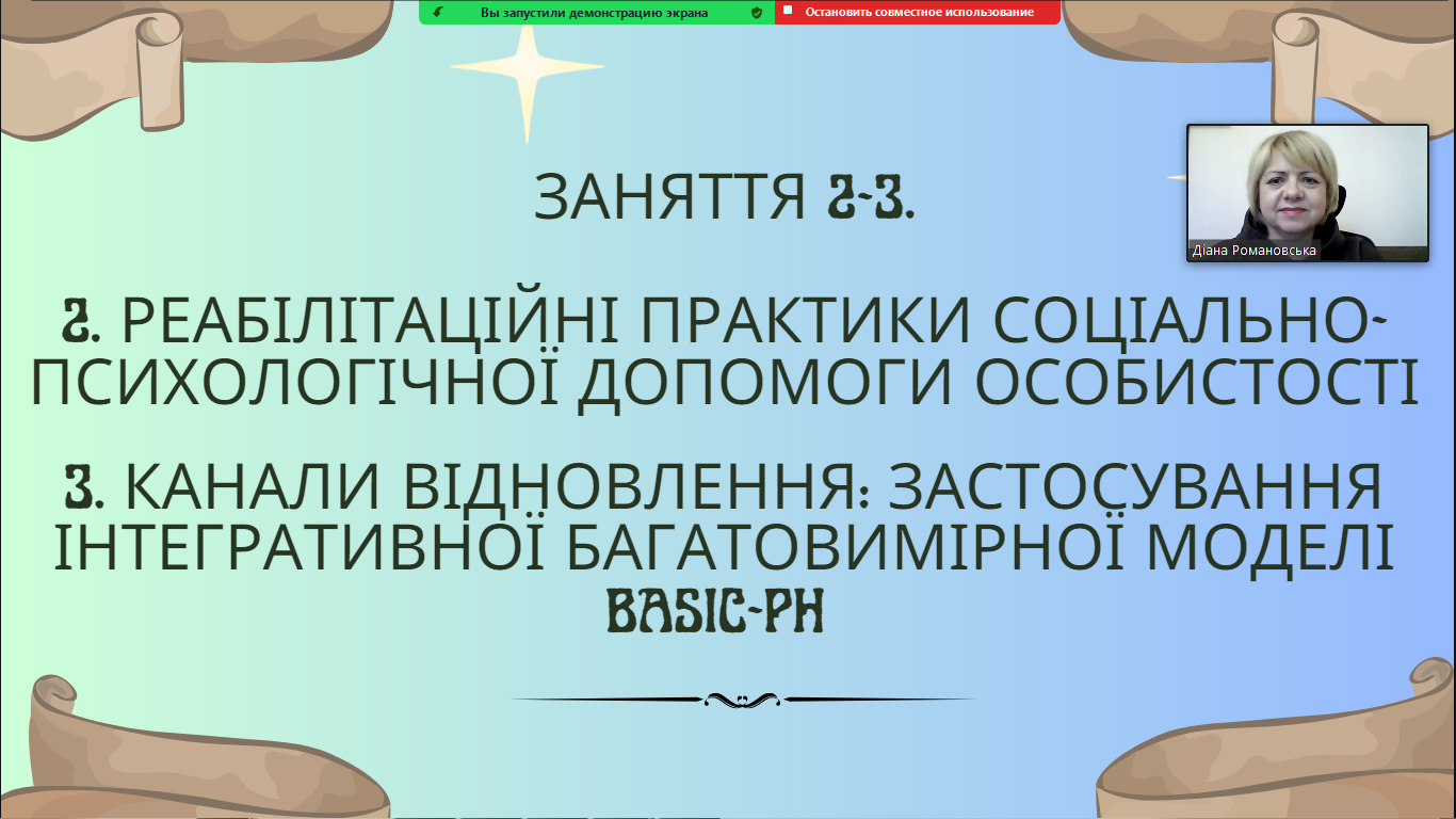 Другий і третій вебінари з тем «Реабілітаційні практики соціально-психологічної допомоги особистості», «Канали відновлення: застосування інтегративної багатовимірної моделі BASIC-PH» провела Діана Романовська, кандидат психологічних наук, старший науковий співробітник Українського науково-методичного центру практичної психології і соціальної роботи НАПНУ; завідувач науково-методичного Центру практичної психології та соціальної роботи КЗ «Інститут післядипломної педагогічної освіти Чернівецької області».