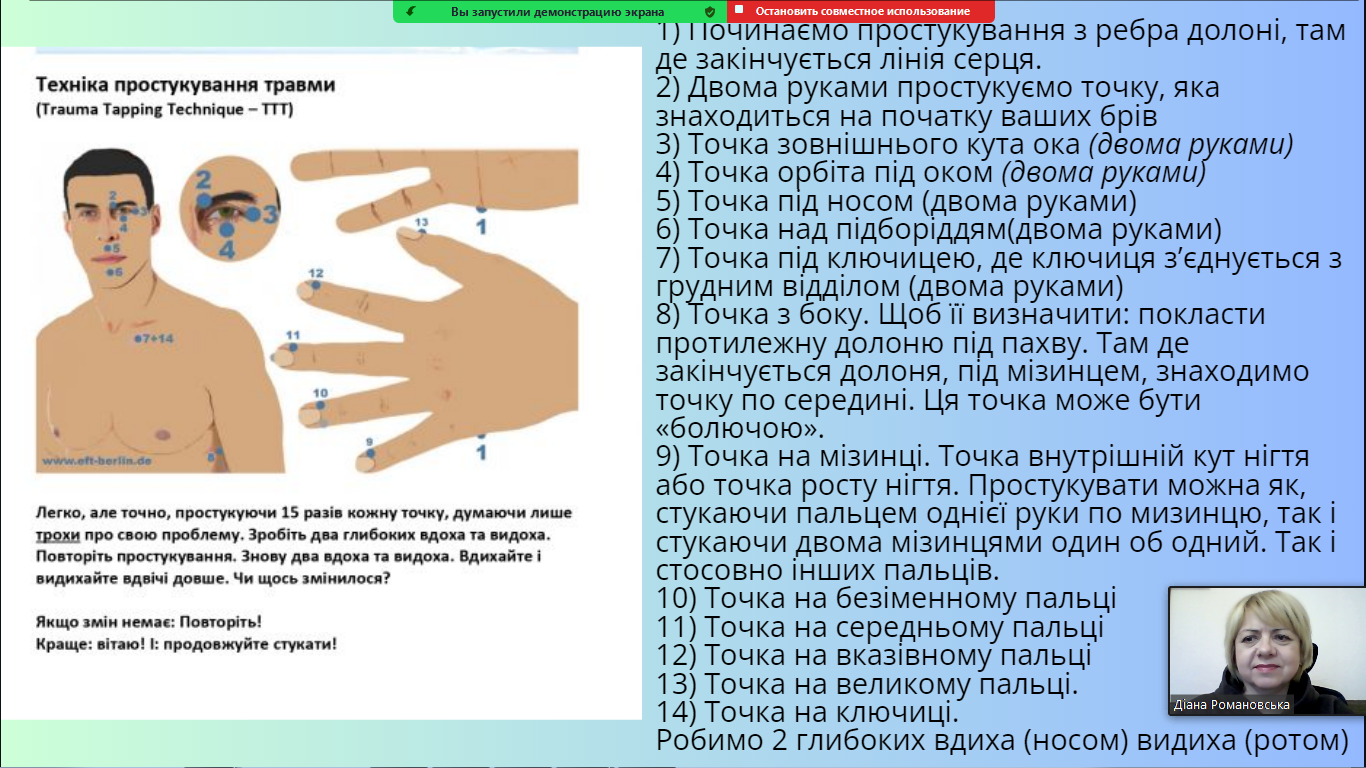 Також учасники можуть самостійно переглянути відеоматеріали щодо застосування техніки ТТТ: «SelfTapping Step-By-Step» https://www.selfhelpfortrauma.org/ ; вебінар«Ганс Герман ТТТ 24.02.22» https://www.youtube.com/watch?v=AADIV0v84ak