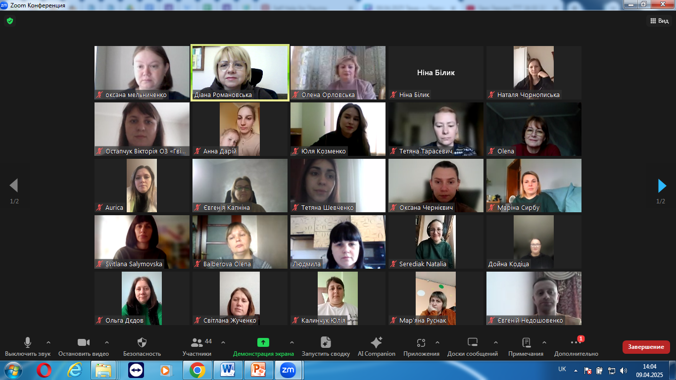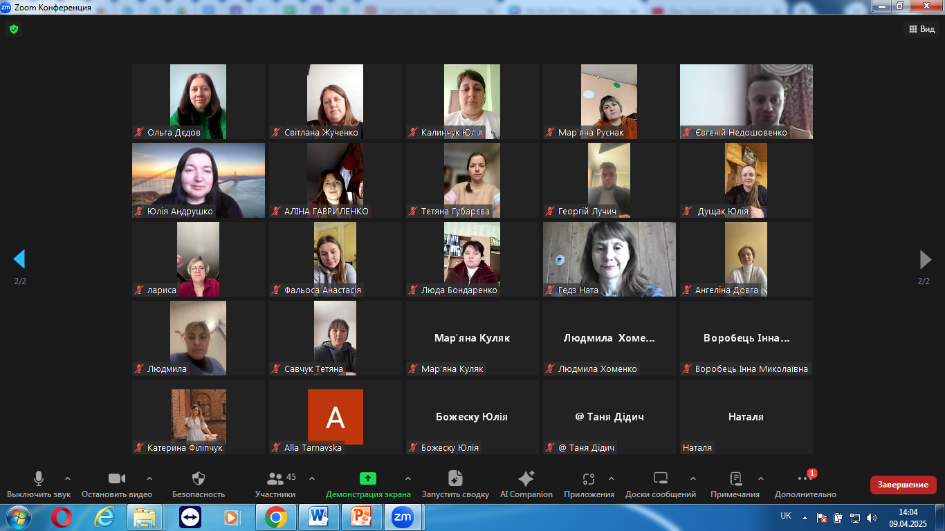 9 квітня 2025 року групи фахівців психологічної служби закладів освіти Чернівецької та Вінницької областей продовжують навчання за «Програмою підвищення кваліфікації практичних психологів з навчання методикам і технологіям постковідної соціально-психологічної реабілітації учасників освітнього процесу».